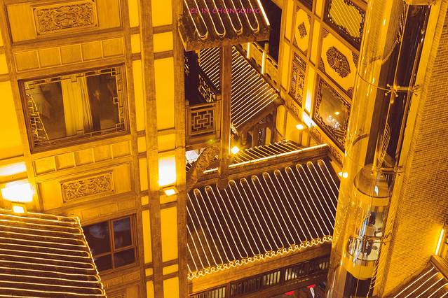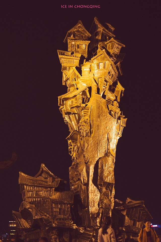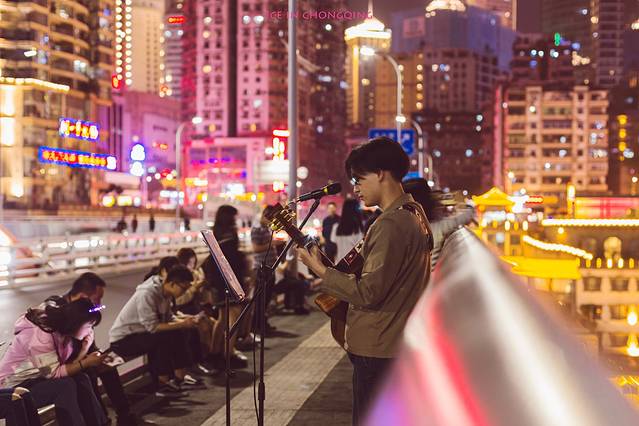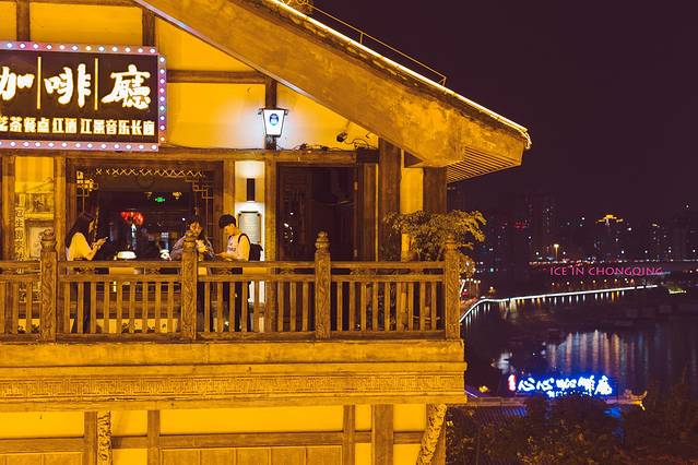 进入华灯初上的洪崖洞,如同开始一场纪念碑谷游戏,你必须迅速将2D视觉转换到3D场景中,然而这里没有旋转、颠倒的通关路径,除了直达电梯,你只有乖乖的绕路寻找通往每一层的步行道。此刻的视线范围内只剩下金黄色,混淆了你的空间感,却清晰了你的听觉;循着乐器的击打声和高辨识度的歌声,你也许会选择一家咖啡馆或酒吧坐上一阵,或是驻足听上一会,周围的人群仿佛都沉浸在各自的娱乐中,无暇顾及你的举动。