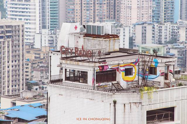 因为几乎是直线向上,让我们不得不走走停停,有点跟不上这位矫健的大叔,直问快到了吗?中途还有依山而凿的空洞用来纳凉或是休闲,登顶的时候,公园的这一边是间隔着有观赏平台的长型走廊。这时候,大叔瞬间融入唱戏起舞的同圈人里,这种默契自在的氛围让人羡慕不已。至此,谢过后在公园里转悠的我们,还是惦记着初心地二厂,眼看着楼顶醒目的CITY RADIO,跟着导航怎么绕好像都不对,再次询问当地人,原来要绕到另一边的公园正大门去到鹅岭正街上,再次验证了导航在3D城市会失去方向感这回事。