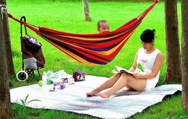 这个妈妈有备而来,带了吊床和毯子,看书照顾孩子两不误。