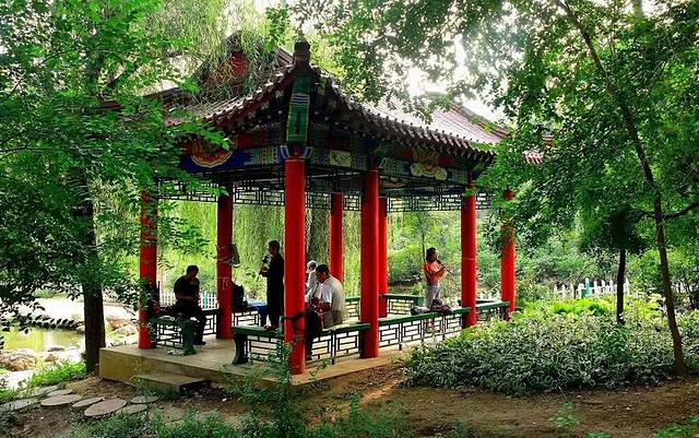 小亭子里的人,在吹奏民族乐器。