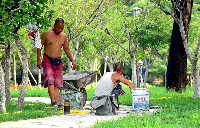 这是正在整修路面的园林工人