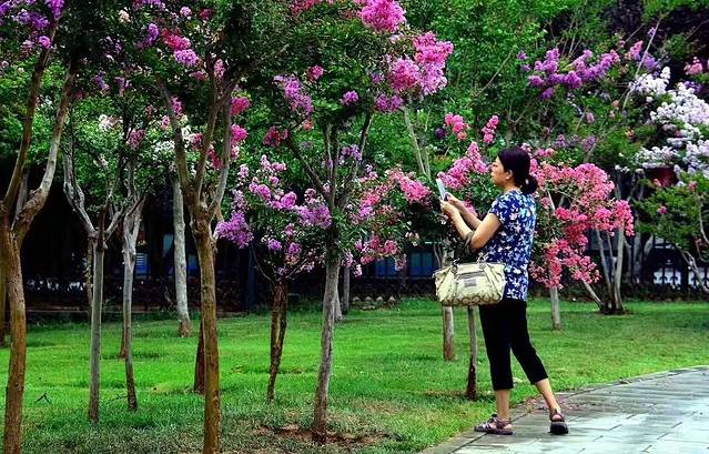 劳动公园一年三季鲜花盛开,这是一位游客在用手机拍路边树上的花。