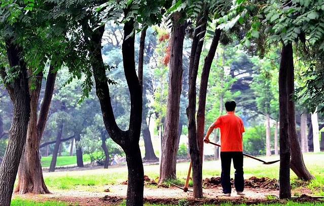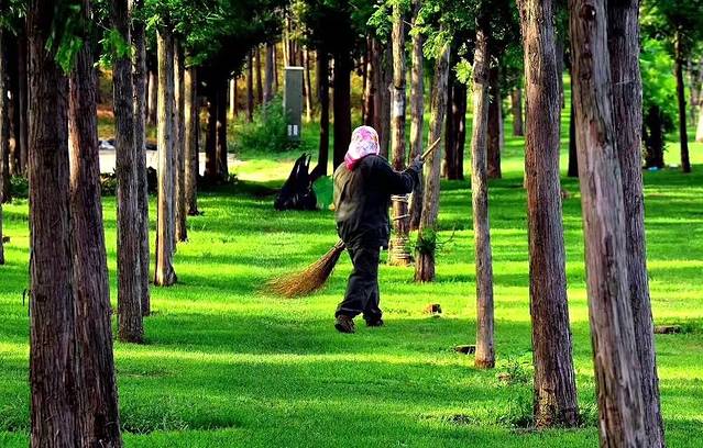 这是正在清扫的园林工人