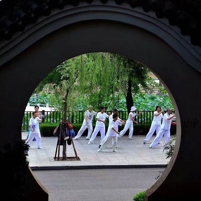 这是一些在劳动公园荷花池畔练太极拳的老人