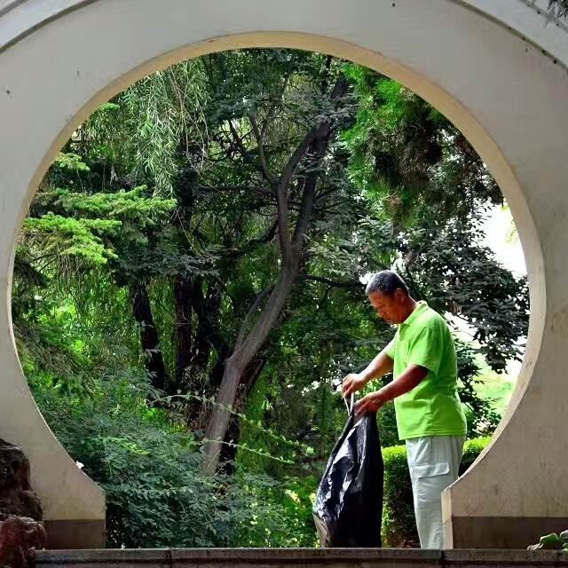 这是正在清理垃圾的园林工人