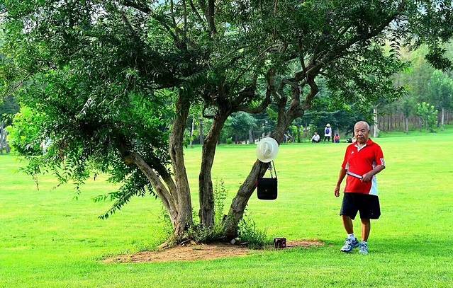 清晨来劳动公园的游客,以晨练的老年人为主。