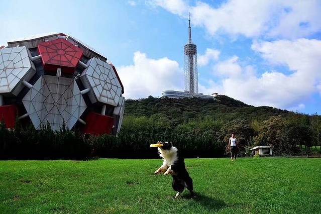 这只小狗的后面,是劳动公园的地标建筑——红白足球形的建筑艺术馆。