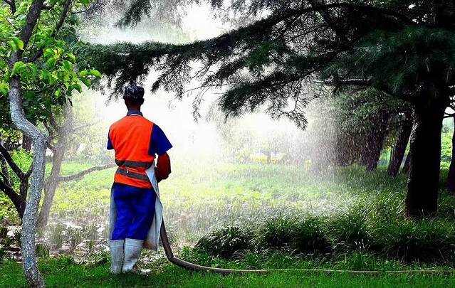 这是正在浇水的园林工人