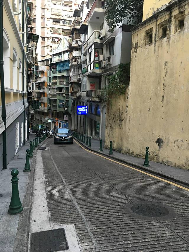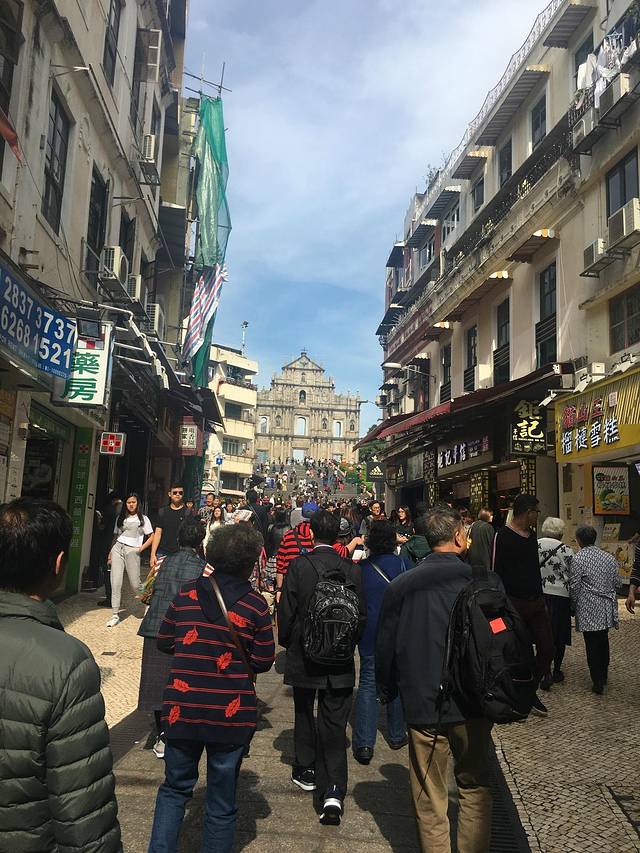 一般去到大三巴都会从议事厅前地一路进去,很好找的。反正那块地方都很热闹,人很多,商店也很多。一路进去的话会见到各种样式的建筑、各种商店,然后一转弯到了个空地那边,大三巴牌坊就很明显地屹立在那里了。