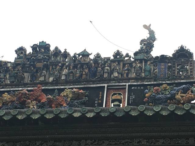 整个景区是感受岭南建筑最好的地方之一,里面融入了很多西方元素,建筑体现的是中西结合,比江南建筑多了点元素,比如有琉璃,这在江南建筑、徽派建筑是基本没有的,窗花很精致,墙雕很精美,上面刻划的生物惟妙惟肖,细心的话可以仔细看看它的屋顶雕塑,简直就是鬼斧神工