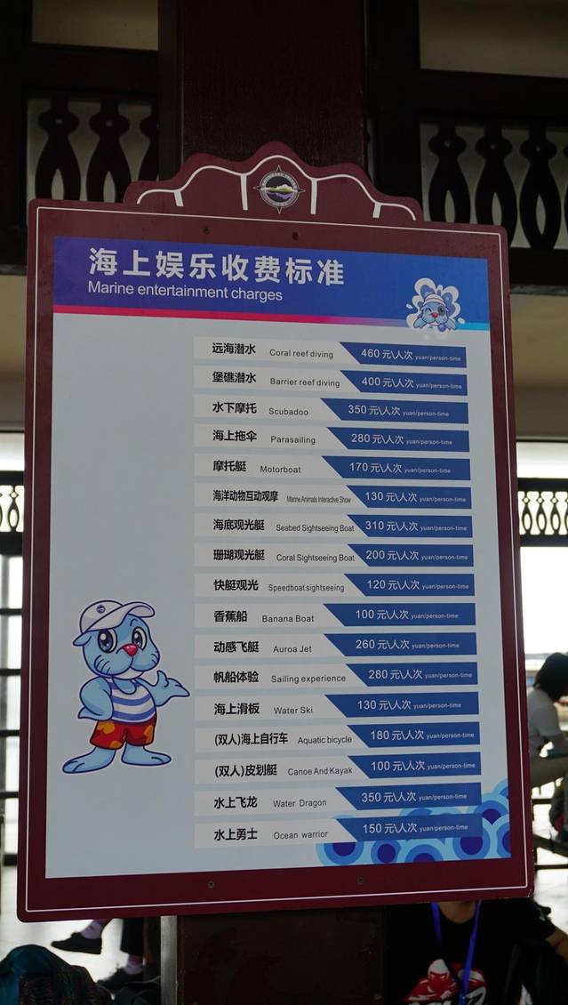 岛上的住宿与娱乐项目收费情况,供参考吧,也许网上会便宜点,楼主只是单纯的逛海岛,所以没有去玩,留到以后结婚来玩,因为这里真的蛮值得再来一次