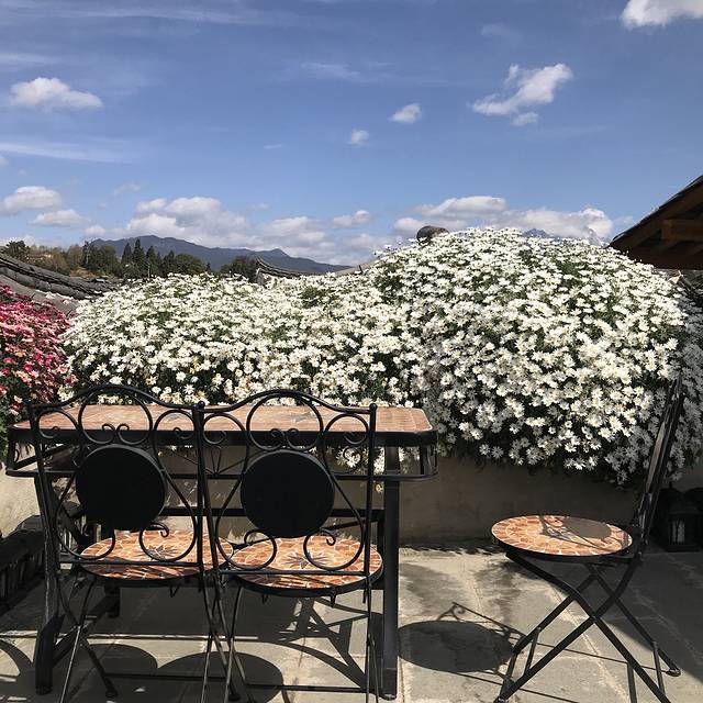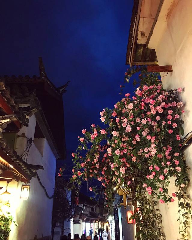 客栈门口的花,即使是夜晚,天空中的云依然清晰可见,云南的天好蓝