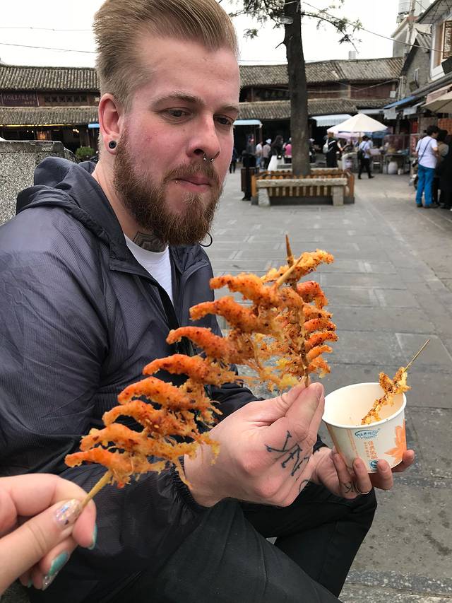 炸小虾和鱼,10块钱3串,感觉超值,威廉一开始是抗拒的,但是吃了一口之后就根本停不下来了