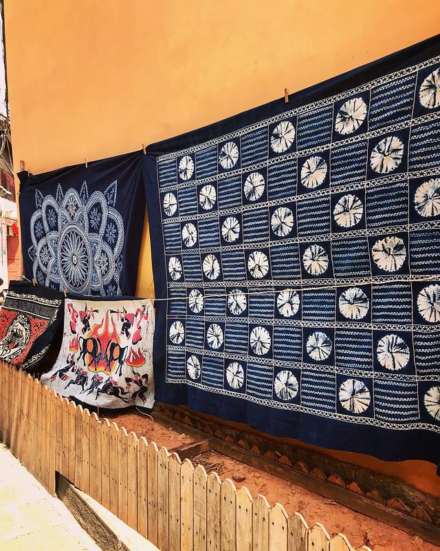 传统扎染工艺,很有名,到处都是这样扎染晾晒的布料