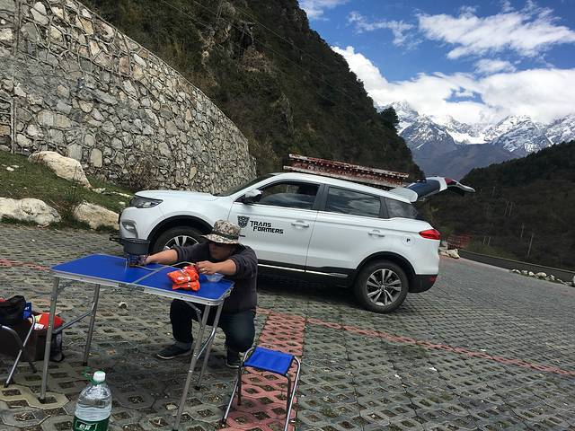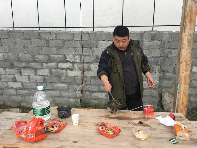 中午开始野外第一餐面条,在这种蓝天白云下风景下做饭,也是一种享受啊!随便找的地方是一个自驾游露营基地,可以自己搭帐篷做美食,欣赏远处的雪山。