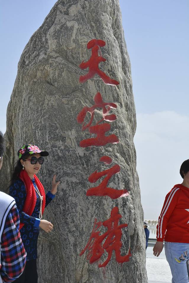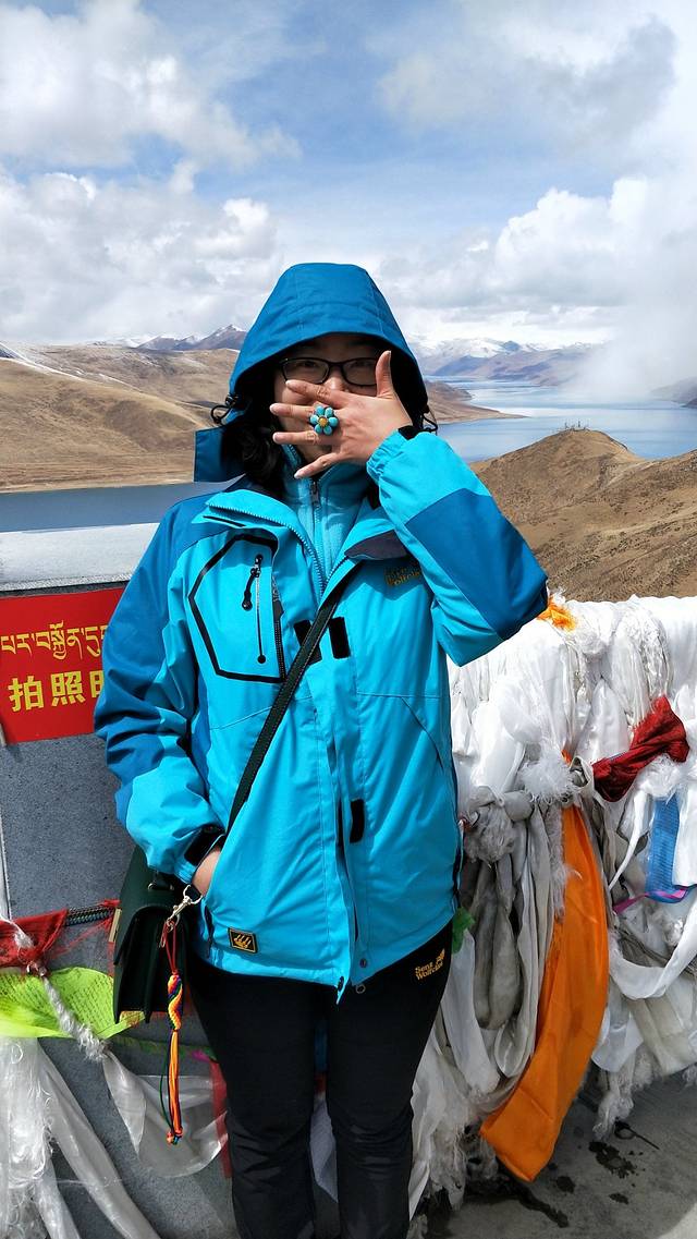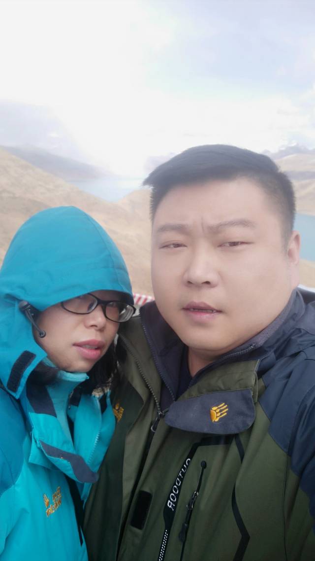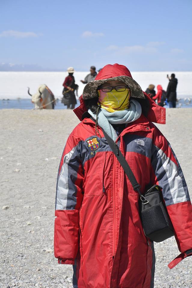 这个季节的纳木错很冷,湖面的冰慢慢融化了。老婆怕冷,路上租了件棉衣。