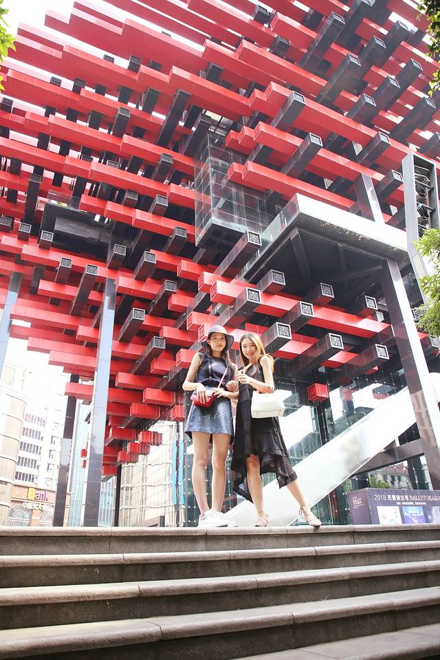 洪崖洞11楼的楼顶,原来又是一条大马路。顺风而行,穿过由「火锅筷子搭建而成」的国泰艺术中心,很快就到了重庆的商业中心兼精神堡垒——解放碑,一览繁华。