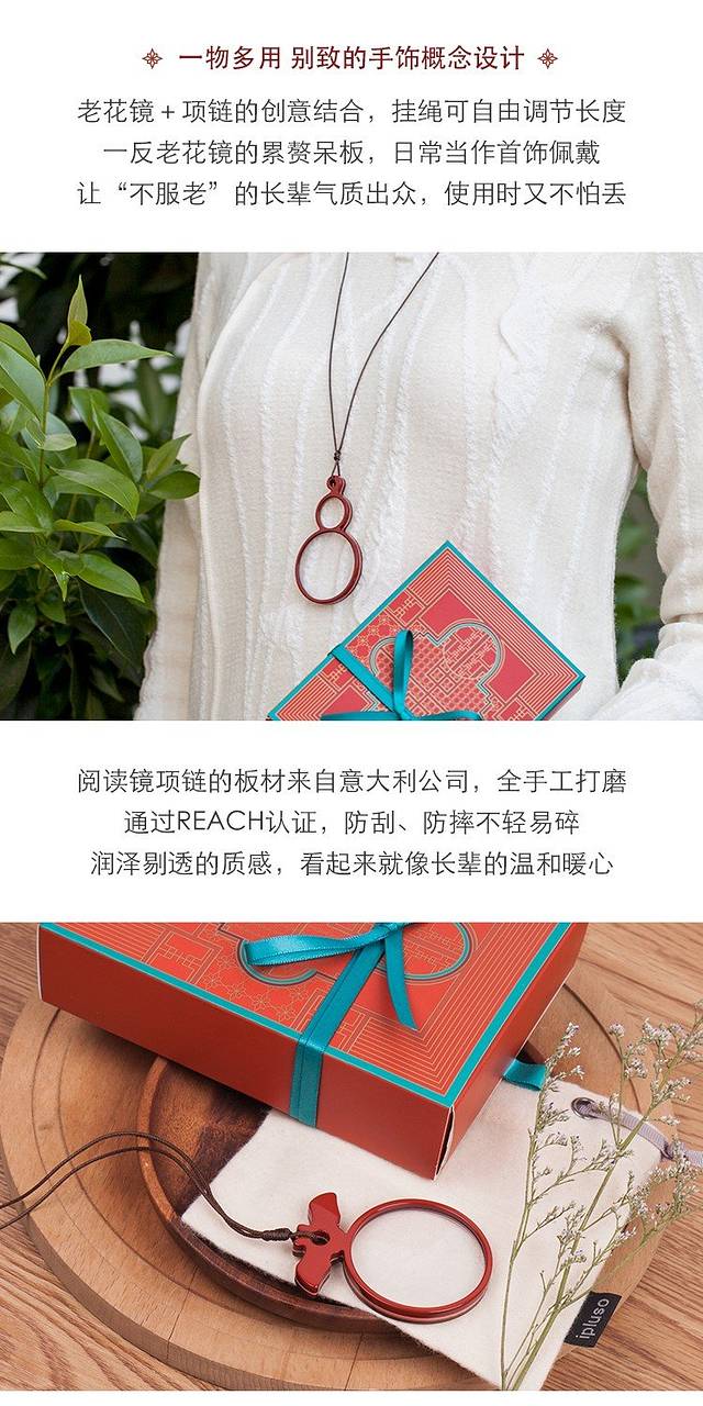 老花镜和项链的强强组合,颠覆了老花镜的传统呆板,同时还可当做首饰佩戴,给妈妈增添了“不服老”的气质!