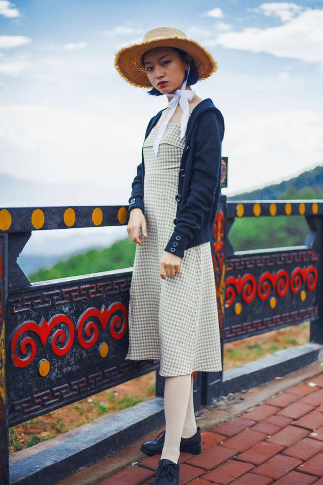 · 牧场 森系复古风—平沿草帽+格子收腰长裙