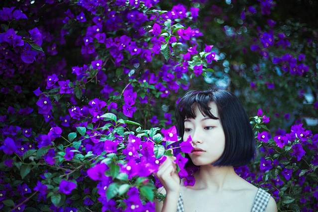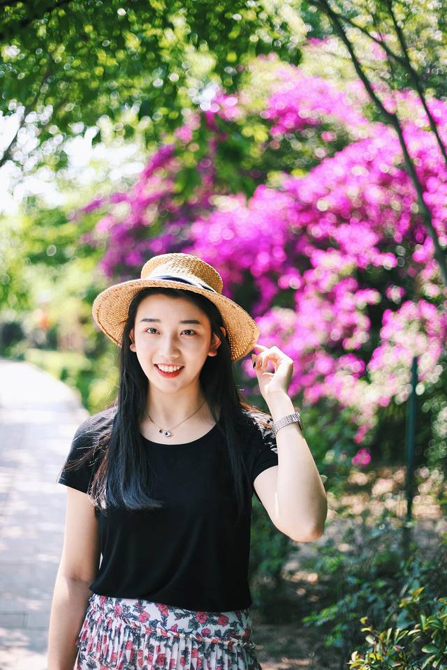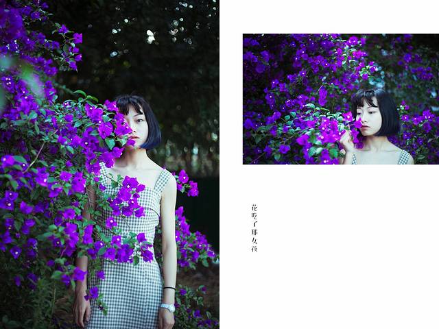 应该调整为:人站在花的空隙处,「与花有互动」,或嗅或观望或弄头发或帽子遮挡低头开心大笑。并注意镜头方向,摄影师应该站在花丛的正对面去拍,这样的背景就不是马路。如果背景杂乱就拍竖图