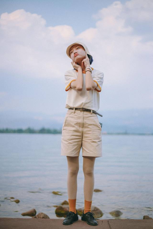 · 邛海 小清新/复古胶片风—白色渔夫帽+白T黄边+工装五分短裤