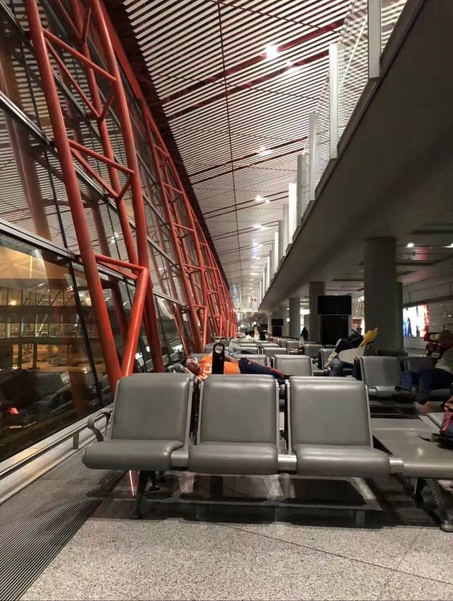 这时机场有的是空椅子。办完各种手续团员们都找地接着睡了。上飞机就有饭吃,所以你饿了就吃点,不饿就睡。