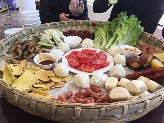 距泸沽湖还有半小时车程的时候,下车吃午饭。吃的是手抓饭配萝卜汤,用手抓着吃,当然是戴了手套的手。手抓饭味道还行,萝卜汤把我丢在路上的魂捡回来了,第一次这样吃饭,挺有意思的