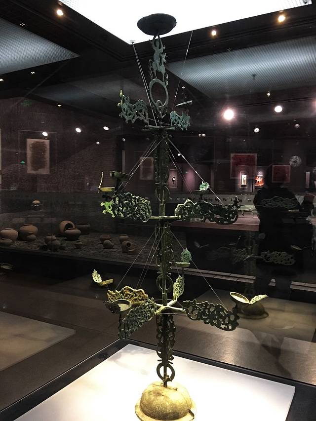 东汉,铜连枝灯,出土于甘肃酒泉,通高71.5厘米。灯座呈覆钵形,弧面饰有方孔圆形钱币连续镂空图案,所以又称摇钱树形灯。中间立一枝灯柱,分为两节,上细下粗,顶端置一圆形灯盏,盏岩饰三片桃叶形叶片。中部饰两层互不重叠并且错落有致的灯枝,每层各伸出三个“S”形镂空雕刻的叶片,在叶片各置一灯盏,灯盏口沿饰一片桃叶形叶片,在每层灯枝下面的柱杆上饰有相对称的两片树叶,其中上面的两片各饰一枚圆形钱币图案。整个灯似树形,干、枝、叶、灯盏分别铸造,之间皆有榫卯、榫口各异。这盏树形灯铸工精巧、造型独特,形体纤细玲珑,具有很高的艺术性,也体现了汉代独特的审美意象。