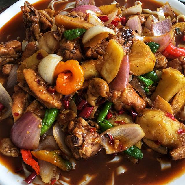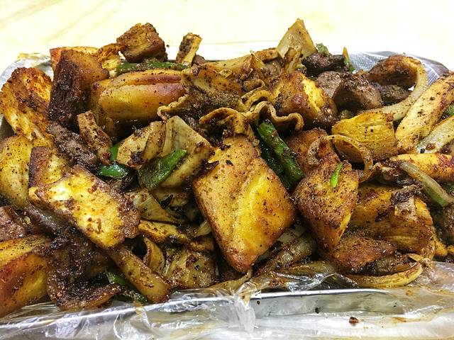 作为一名广东人我觉得我的口味已经离清淡是越走越远了~在这里吃多重口味都能接受。拨拉主要是有羊杂、馕饼、青椒、洋葱、土豆加很多的孜然粉炒的一道食物,这里食物添加剂就是很多很多的孜然粉。