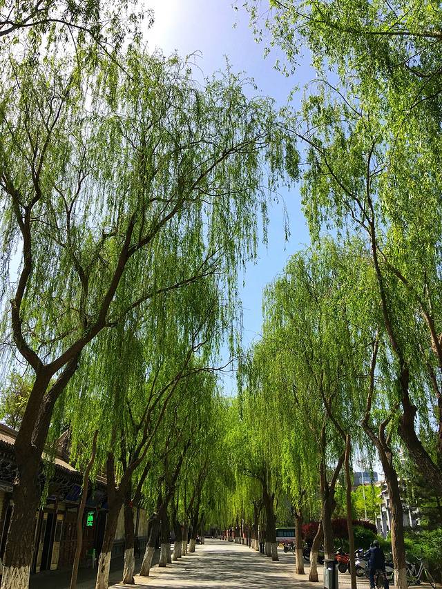董记牛肉小饭旁边就是山西会馆,但我们去的时候没开门,不然从旁边进去也是大佛寺的一个入口。吃完后我们沿着旁边有复古建筑设计式的商铺一路走到了大佛寺巷,一路的柳树长的很高。这条巷车是进不来的~