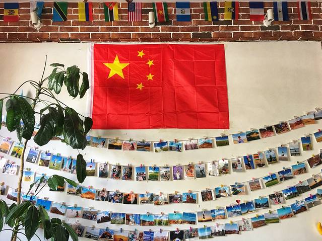 进门就是一大面国旗,上面还有各个国家的国旗。一路上楼梯时候我发现为什么只有以色列的国旗是贴在墙上的,董哥说因为上面的旗子没有这个国家的国旗,上次有个以色列的小哥来看了以后有点生气,自己画了两面以色列国旗贴在青旅的墙上了。