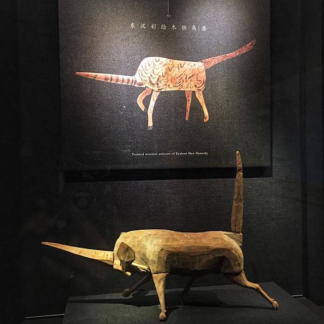 长57厘米,甘博共有三件木独角兽,这件是最简单也是我最喜欢的,它的身上有一种简单原始的力度和气势。独角兽又名獬豸,是传说中的一种神兽,能抵御邪佞,将其置于墓葬门口,是为了起镇墓辟邪的作用。
