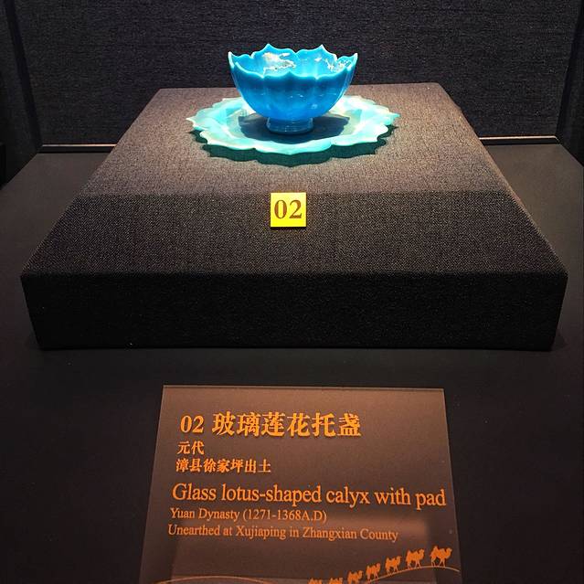 玻璃莲花盏托出土于1999年,甘肃省漳县汪世显家族墓葬第二十号墓中,盏与托各一件,其中盏由普蓝色玻璃制成半透明,口、腹部为七瓣莲花式,底为假圆足,底心微内凹,以尖锐的莲瓣尖组成口,整个器型仿佛一朵正在盛开的莲花;托的内圈为八边形,斜内凹,口沿稍扬起,作八瓣莲花状,瓣尖亦尖锐,平底,颜色比盏略浅。