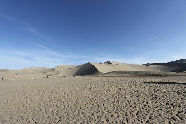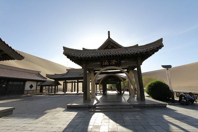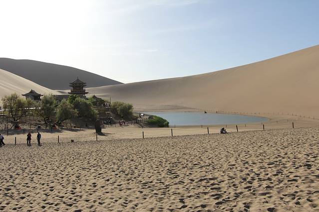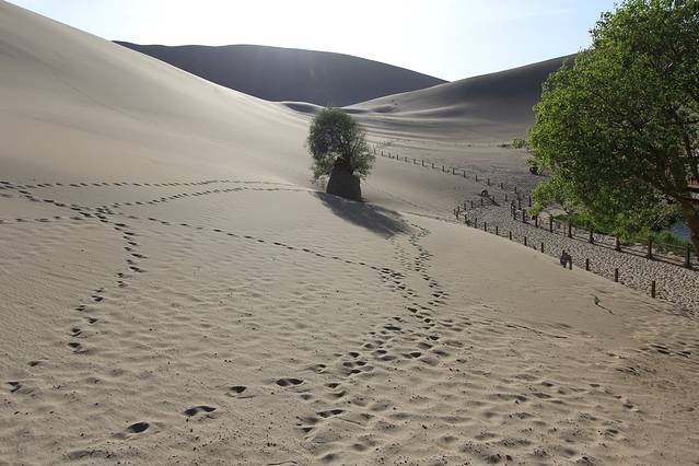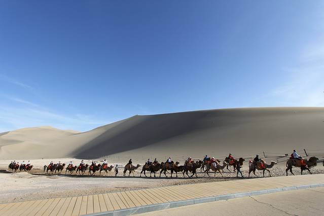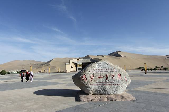 2018年5月5日,中午11点退房;乘GS7587次航班,13.10分由西安起飞,于16.30分抵达敦煌机场。在机场的“神州租车”,租用“朗逸”直奔“鸣沙山月牙泉”景区。景区门票120元;景区门口到“月牙泉”,有摆渡车,单程20元。进入景区右手200米处,是乘骆驼的地方,每人次100元,时间为一个半小时。刚开始骑骆驼很不习惯,需要一点时间自己适应和体会;牵引骆驼的师傅会在沿途帮助拍照、摄像,每人需要格外付20元“服务费”。骑骆驼的终点可以回到出发地,大多数人选择在鸣沙山下,直接爬山观日落。我们是在20点到达鸣沙山下的,眼看着太阳就要落山,匆忙往山上爬。鸣沙山太难爬了,爬一步,退半步。气喘吁吁、浑身大汗地爬到高处,总算是看到了落日的余晖。下山很轻松;赤足踩沙,与上山不同的是,走一步滑一步,一步顶两步。疲劳,并快乐着。晚,住“去哪儿”预定的“敦煌饭店”,标间145元,非常满意;离“敦煌夜市”5分钟的路程。