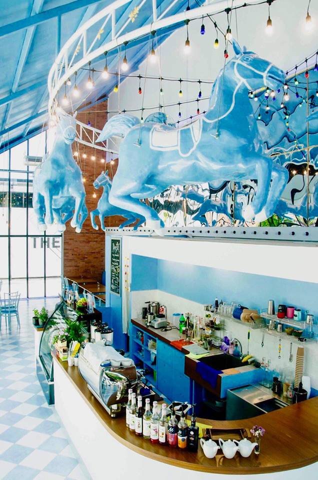 一家以游乐园为主题的甜品店,整个大厅都以天蓝色为主题,最具游乐园色彩的就是好几匹挂在天花板上的蓝色旋转木马,就像天马行空一样,非常吸引人,一秒回到游乐园的代入感。