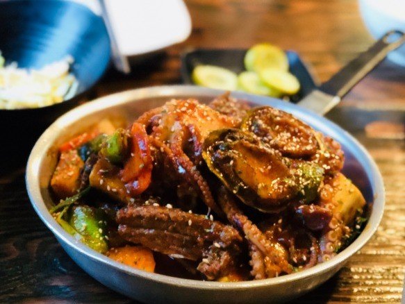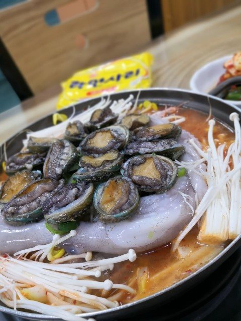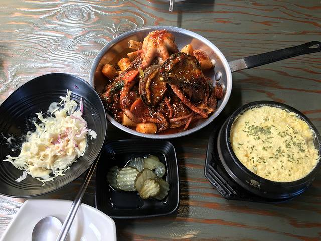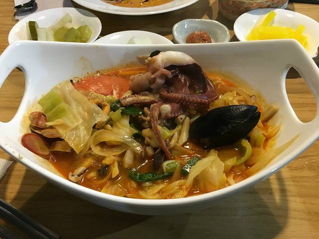 鲍鱼+章鱼+猪排辣锅39000+鸡蛋羹2000+炒饭两份6000。 一共4万7千韩币,大概300元RMB。