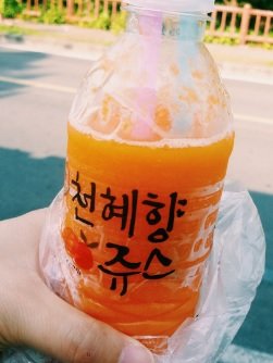 等车的时候看见卖当地天然柑橘汁,买一瓶尝了一下。很纯,但小贵。300ML的一小瓶3000韩币,折合人民币20元。