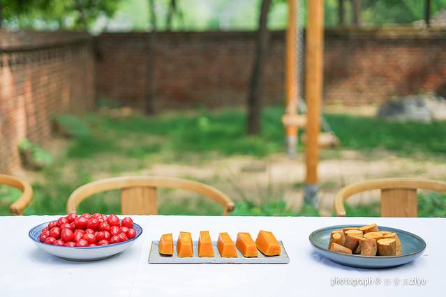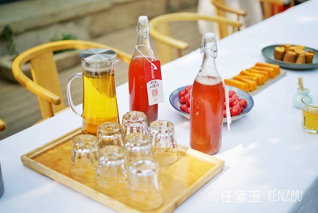 这是农家院版的下午茶啊,才不是我以为的蛋糕、饼干和红茶。而是红薯、小番茄,还有小院儿管家(也就是村里阿姨)自己熬的山楂汁,在一片绿荫的小院子中,格外喷香。