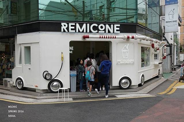 在林荫道区隐秘的小路街口的转角,店面的样子仿佛是停在这里的一辆小汽车的店就是乌云冰淇淋的创意店REMICONE。