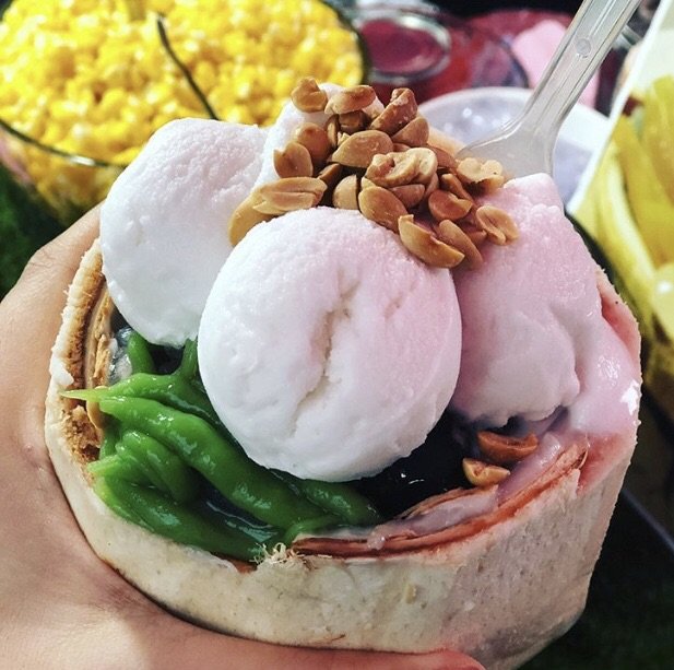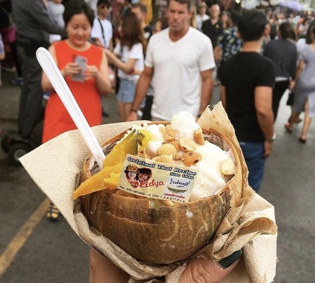 椰子冰淇淋也是泰国的网红哦,椰子壳里放上新鲜的椰子肉,再放上一个冰淇淋球,撒上些花生碎。椰肉蘸着冰淇淋吃一口,绝对欲罢不能。