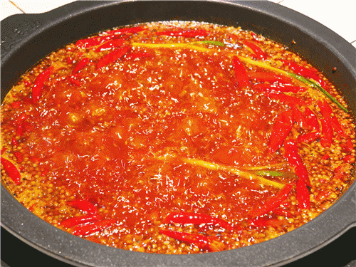 锅底采用全牛油,味重醇厚,辣而不燥。