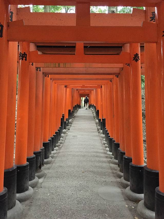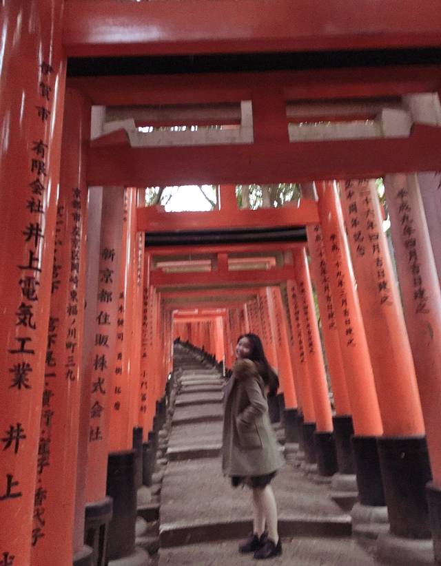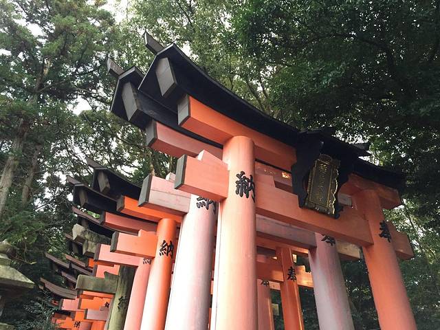 从奈良我们直接换成到了【伏见稻荷大社】,到的时候已经是傍晚,但是人还是很多,我们看到很多人在里面祈福、许愿之类的,因为出国前就和大大怪达成一致,日本(尤其京都)神社很多,我们进去之后只参观,不许愿。所以我们走马观花的走了一圈,便看到了网上很多人拍的【千本鸟居】。红红的一长条,随着山路一直蔓延,如果不是太阳西下,我们真的很想沿着这条红色的隧道一直走下去,上山看看。据说,通过鸟居,即有让心愿通过的意思。