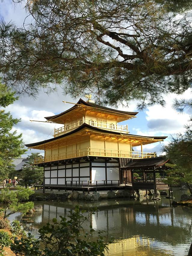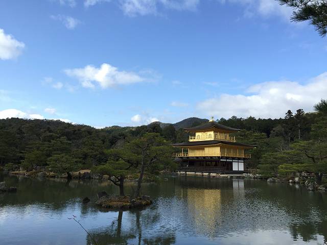 据说金阁寺是一休哥里面那个大将军府邸的原型,我很好奇他真正样子是不是真的很闪,后来事实证明,食物看起来是真的很值钱的样子金阁寺需要买门票,门票好像有护身符的作用,可以保留纪念。一进去就能看在湖中央金光闪闪的金阁寺啦,黄灿灿的一大个。