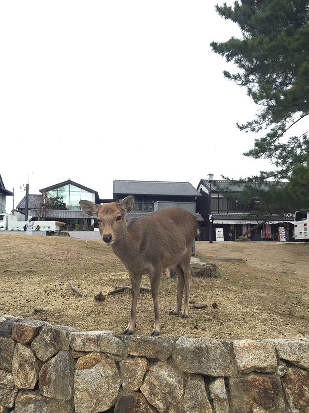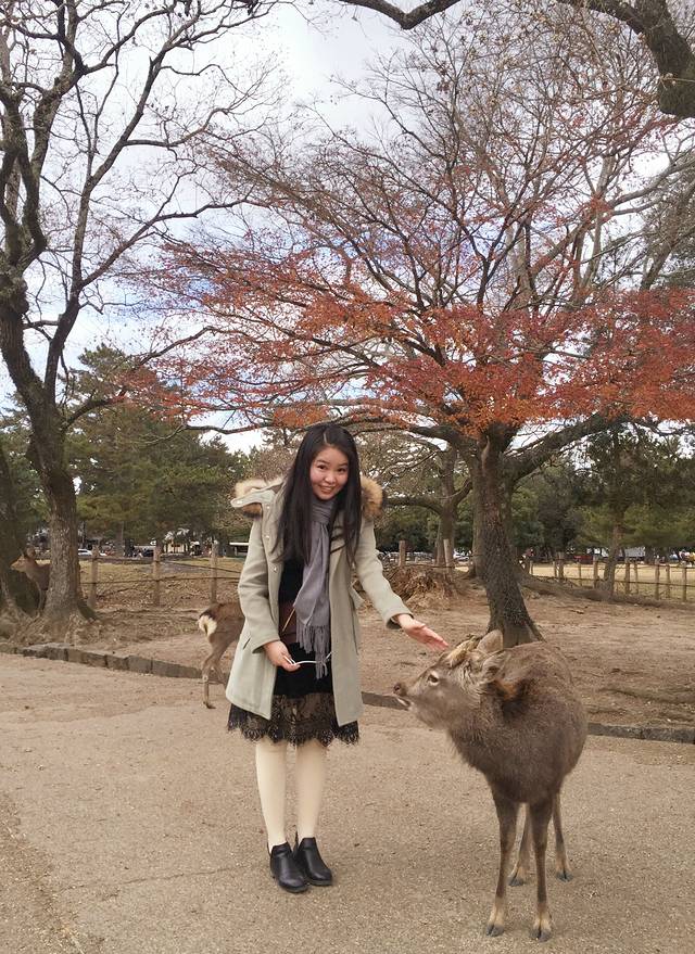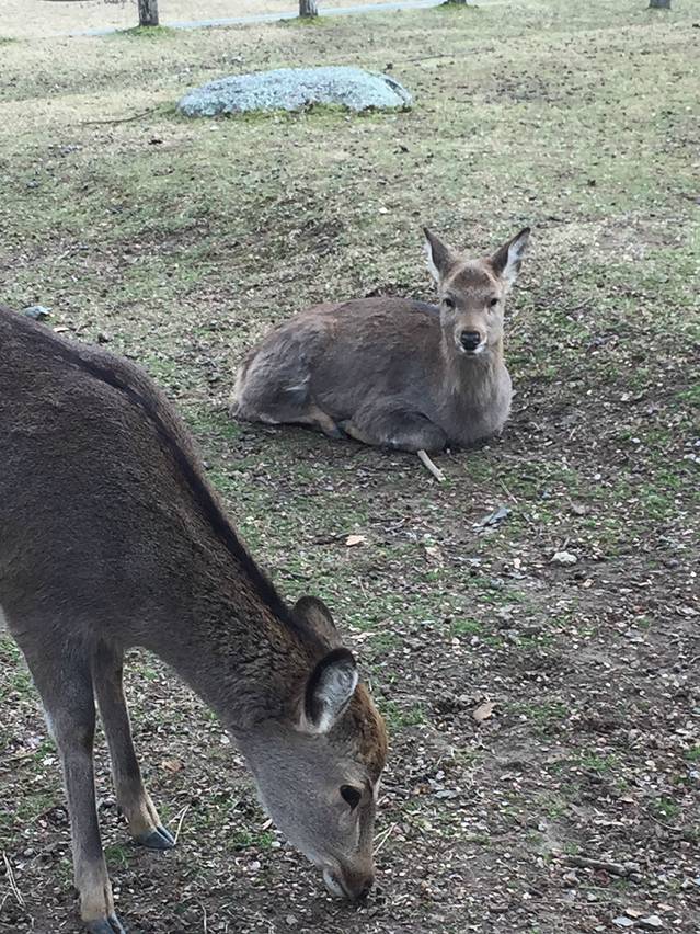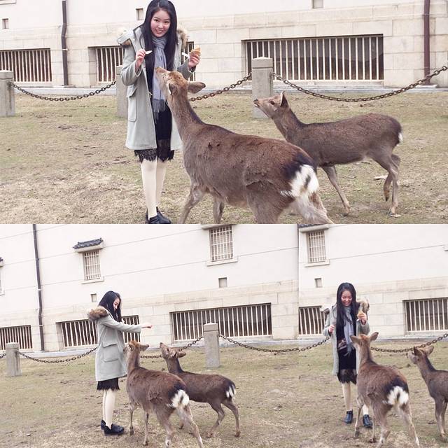 一个小时左右就到了奈良站,下车后我们两门两个突然有点摸不清路,因为我来之前攻略上只写了奈良公园,事实上奈良公园很大,根本不知道坐什么车,也不知道坐车根本不知道做到哪一站,我就用我我蹩脚的英语,问了公交车站的大叔,大叔很热心但奈何我们也不知道具体要去哪里,只能更具我们说的奈良公园做出了指示。我们原本以为要坐七八站,结果才开了三站左右我们就发现了零星的小鹿在路边,然后在开出一站,小鹿越来越多,第五站的时候我们忍不住下车,然后就往小鹿的方向走。其实奈良公园好像没有明确的界限,也不用买门票,反正我的目标是小鹿呀。路边有个小店在卖鹿饼和一些吃食,鹿饼500一份,我们没有带别的吃的,就买了一份,用大大怪的话就是那几饼比我吃的还贵!我们已买吃的,就有一群鹿涌了过来,真的一点不夸张,还好之前看攻略得知他们会抢吃的,所以要把饼举高一点。然后大大怪就看到我在前面奔跑,后面追着一群小鹿,时不时的还被顶一下屁股咬一下衣服。