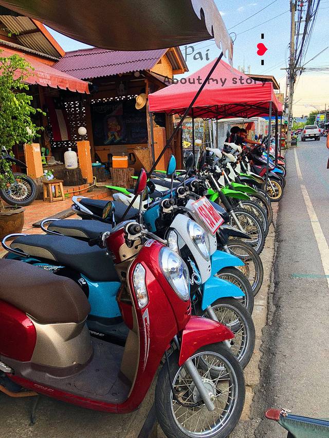 拉着行李从汽车站走到转弯角第一间店租小绵羊,误打误撞遇到一个很不错还懂中文的老板,租了一台排量蛮大还送一箱油才150铢每天,押护照或者交2000铢押金,摩托帽免费提供,还帮我们把行李送到民宿,真好。