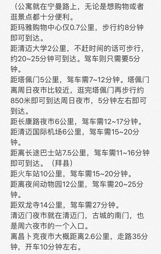 入境时由于找不到公寓的英文名字担误了点点时间,出去就能见到民宿房东提前帮我们预订的接机服务,现金支付给司机200铢,15分钟车程,我们的民宿在宁曼路,名字叫airone青云高档公寓,订于airbnb,用了一张75元的优惠券只需74元/2人,地理位置超好,走700米就能到玛雅购物广场,房东回复率也是百分百,还免费保管行李,房间的饼干和水也是免费,五星推荐🌟🌟🌟🌟🌟