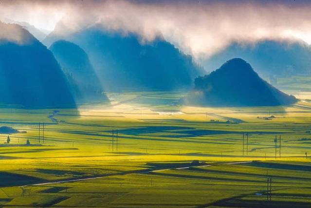(1)金鸡峰:此处的油菜花田比较平坦,远处有小山丘凸起,一望无际。适合日出拍摄以及进花海