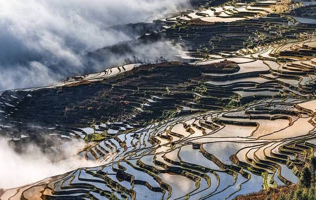 哈尼人用祖祖辈辈的的血肉月汗水所铸就,历经1300余年,最终呈现在我们面前的便是这百万亩分布在哀牢山中的元阳哈尼梯田。冬日梯田放水之后,元阳梯田仿佛变成了天空下巨大的网状镜面,每到日出日落,梯田光滑的水面反射出的是充满魔力的光芒,无数摄影爱好者为之神魂颠倒。