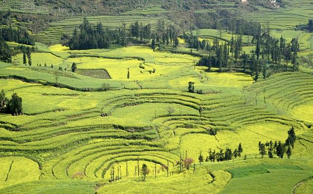 (2)螺丝田:梯田中的油菜花,从山上往下看,梯田就似一颗颗的螺丝,田间还兼种一些树木,与金鸡峰的壮观冲击不同,但也却别有独特之处。最佳拍摄观景时间为午后到日落期间。