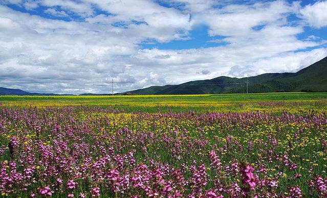 全年常青的高原冷杉林与铺满大地的紫色高山杜鹃,就仿佛是一个瑰丽的画卷。同样的时间点上,香格里拉的小中甸牧场也丝毫不逊色,虽没有挺拔的高原冷杉相伴,但是传统的藏式村落与小中甸紧紧相依。